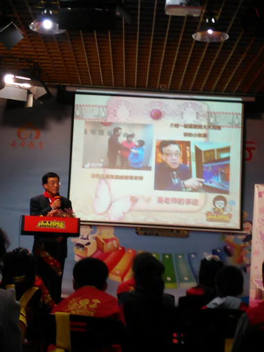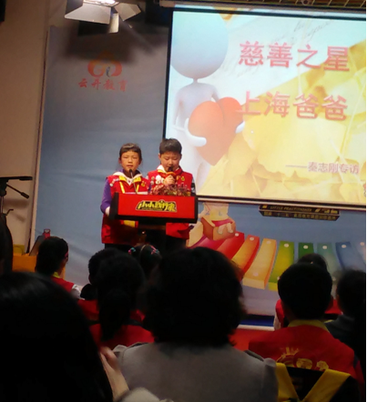 首先,秦爷爷上台讲述他这18年来的慈善过程、经历。他是那么的和蔼可亲,是那么的坚定,他,把慈善活动走到今天,走到我们的小小践行家的圈里来,秦爷爷用简朴而真实的话语感染了在场的所有的人,我们为秦爷爷鼓掌,我们为上海有着这样的慈善爸爸而感到骄傲。